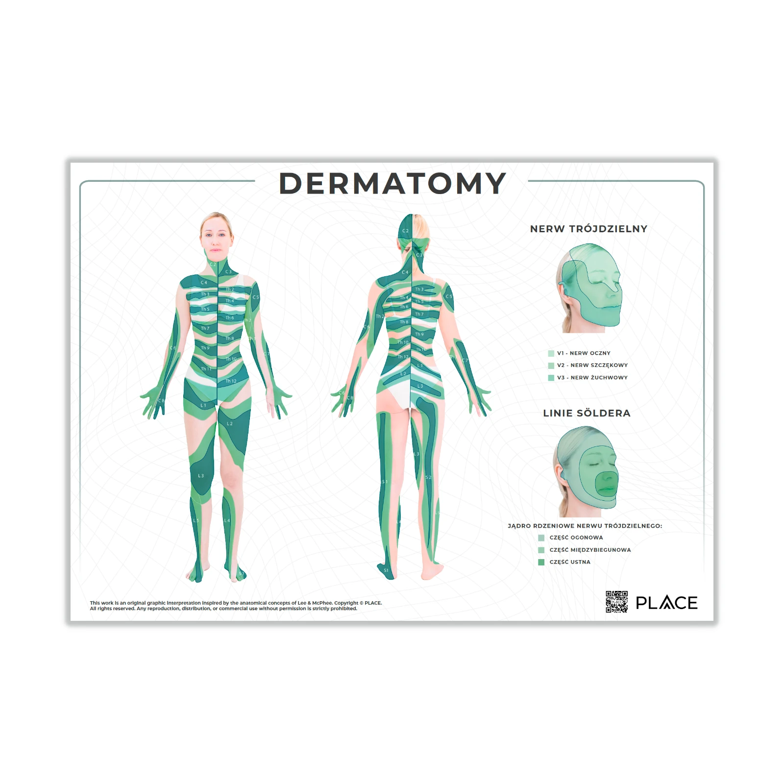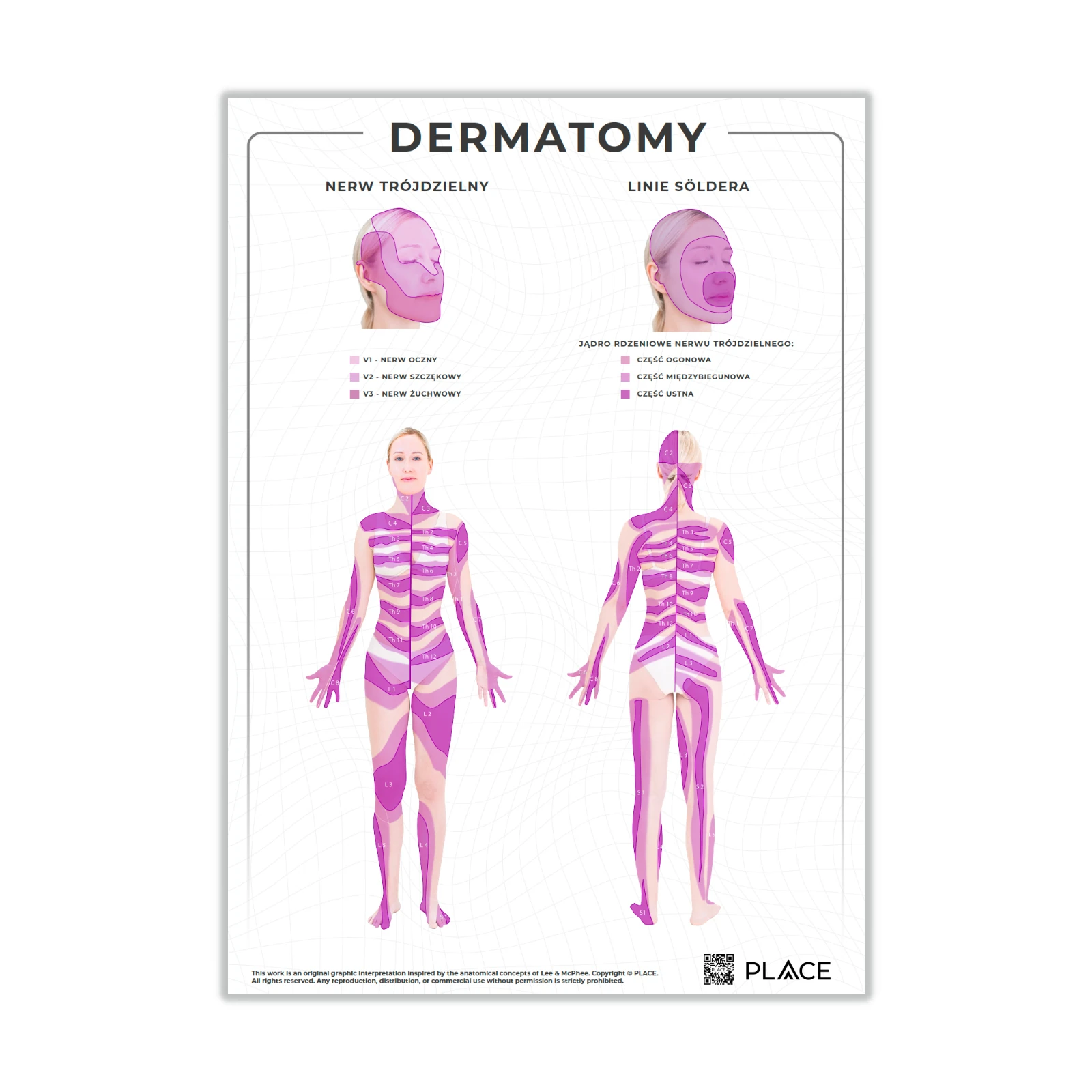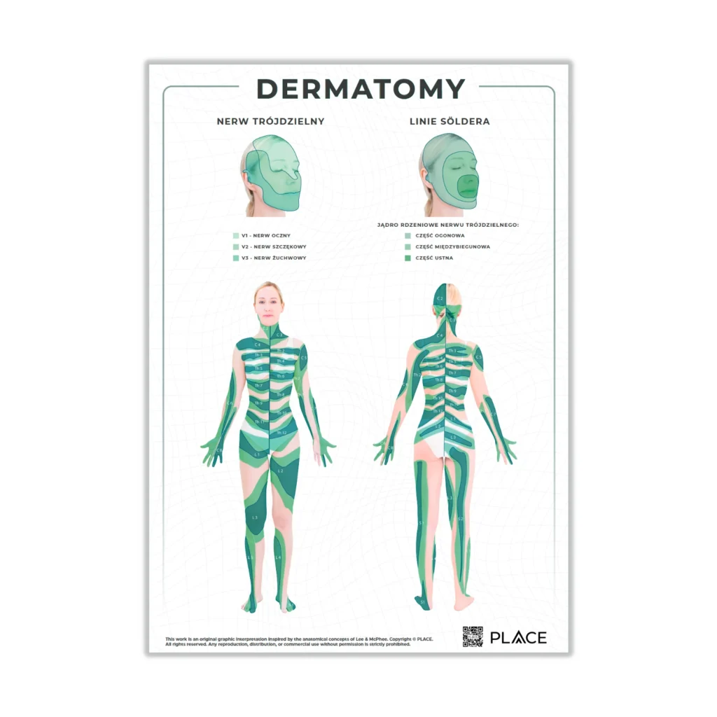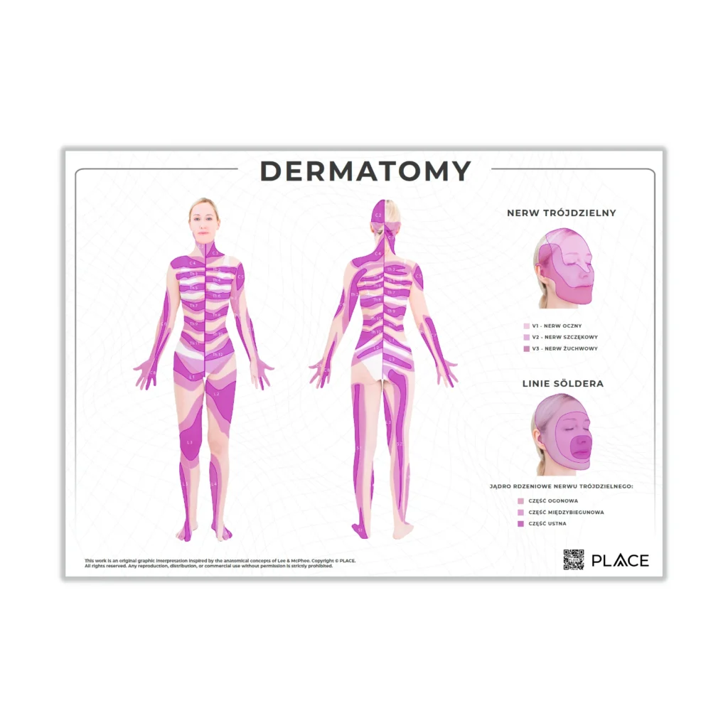 Plakat anatomiczny przedstawiający topograficzny układ dermatomów człowieka w widoku przednim i tylnym, wzbogacony o zakres unerwienia nerwu trójdzielnego oraz segmentację poszczególnych części jądra rdzeniowego nerwu trójdzielnego. Układ graficzny inspirowany koncepcją anatomiczną Lee & McPhee. Charakteryzuje się wysoką czytelnością oraz zgodnością z aktualnym stanem wiedzy neuroanatomicznej.